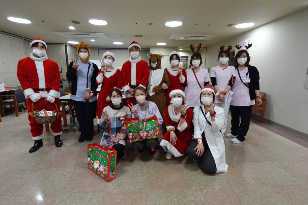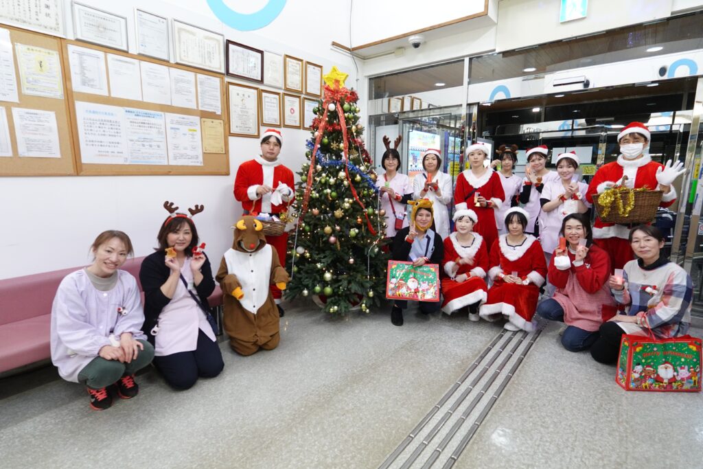 12月10日、当院では毎年恒例のクリスマス会を行いました。これは、昼の部と夜の部にわかれ、職員がサンタさんやトナカイさんに扮して、ご来院された患者様やご家族様に、プレゼントをお配りするという催し物です。